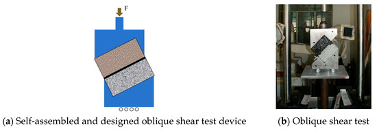 The oblique shear test employed an MTS mechanical testing system integrated with a custom shear fixture (Figure 5), applying a loading rate of 2 mm/min determined through preliminary trials to prevent premature specimen failure. Testing was conducted at 20 °C, 35 °C, and 50 °C with continuous load-displacement monitoring. Interlayer shear strength (τ) was calculated using Equation (1) [18], while bonding strength was determined via Equation (2).