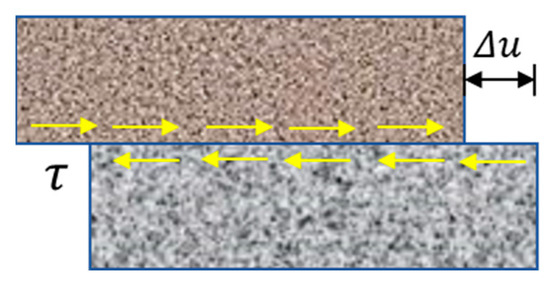 Multilayered elastic theory (MLET), assuming isotropic materials and fully bonded interlayer continuity, serves as the foundational mechanical model for pavement structural design. While modern computational mechanics enables consideration of partial interlayer bonding [19,20,21], establishing a physically accurate interlayer mathematical model remains critical for precise mechanical response analysis. This MLET theory assumes each layer is homogeneous, isotropic, and linearly elastic, with body forces in the structural layers neglected, while all stresses and displacements vanish at points sufficiently far from the load. The widely adopted shear-elastic compliance model proposed by De Jong [19] addresses this need by representing the interface as an infinitely thin layer where shear stress (τ) induces relative horizontal displacement (u) proportional to τ through the relationship Equation (3), with ks denoting the shear elastic stiffness modulus. This approach has been successfully implemented in layered elastic systems by Maina [22] and Kazemi [23], demonstrating its efficacy in characterizing interface behavior beyond idealized full bonding.