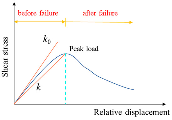 The shear stress versus relative displacement curve [26] of interlayer bonding is shown in Figure 7. It can be seen from Figure 7 that the interlayer shear stress changes synchronously with the increase of the relative displacement value before failure. It is not until the relative displacement increases to a certain critical value that the shear stress reaches its maximum value. Due to the presence of residual stress, shear stress does not decrease sharply. The slope corresponding to each displacement point represents the interface bond coefficient K. The K value is a variable value until the interface adhesion completely fails. Therefore, it is feasible to use the interlayer tangential modulus to evaluate the interlayer bonding performance. Due to the different values of the interlayer bonding coefficient at each position, it is an important issue to use the interlayer bonding coefficient at which point as the analysis index. At present, most studies use the load and relative displacement at the peak load to calculate the interlayer bonding coefficient. The calculation method of the interlayer adhesion coefficient needs to be discussed [27,28,29]. When the interlayer shear strength reaches its peak, the interlayer is already at the edge of failure. The variation curves of shear stress with relative displacement between the asphalt layer–asphalt layer and asphalt layer–CSM are shown in Figure 8 and Figure 9 at 20 °C and 50 °C, respectively. It can be vividly seen from Figure 8 and Figure 9 that the shear stress of interlayer bonding reaches its peak when the relative displacement reaches 2–4 mm. The horizontal displacement distribution of the upper-middle layers and asphalt layer–CSM layer of a 6-layer asphalt pavement structure, which is calculated by the layered elastic system mechanics program in Section 2.3, and was shown in Figure 10. It can be clearly seen from Figure 10 that the horizontal displacement between layers is less than 0.002 mm, and the maximum horizontal displacement is only 0.0015 mm at 50 °C. Therefore, it is not appropriate to use the peak value of interlayer shear stress to calculate the interlayer adhesion coefficient and the actual stress on the pavement structure. The ratio of shear stress to displacement at the initial moment should be used as the interlayer bonding coefficient, i.e., K0 in Figure 7.