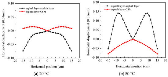 Horizontal displacement distribution of asphalt structure at different temperatures.