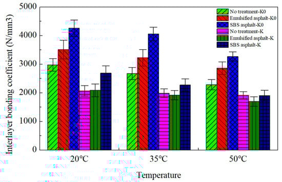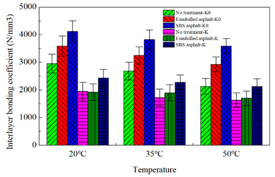 Table 7 and Table 8 and Figure 11, Figure 12 and Figure 13 present interlayer bonding coefficients and bonding strengths across treatment methods and temperatures. The data demonstrate that peak-based bonding coefficients (K) are consistently lower than initial coefficients (K0), confirming K0 as a more rational characterization parameter. Both K0 and bonding strength exhibit progressive reduction with rising temperatures, regardless of treatment method. Notably, inherent bonding persists even without interlayer treatment (though inferior to tack-coated interfaces), while SBS-modified asphalt yields superior coefficients and strength versus emulsified asphalt or untreated interfaces at all temperatures. Crucially, the material discontinuity between cement-stabilized macadam (CSM) and asphalt layers results in lower bonding parameters compared to asphalt–asphalt interfaces.