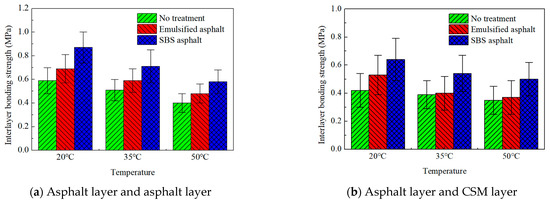 - Oblique shear testing demonstrates significant inherent bonding without treatment, while tack coats substantially enhance performance. SBS-modified asphalt consistently outperforms other methods, providing 40–50% higher bonding strength than untreated interfaces and 15–20% higher than emulsified asphalt across all temperatures (20 °C, 35 °C, 50 °C). Material incompatibility reduces asphalt–CSM bonding effectiveness by 18–25% compared to asphalt–asphalt interfaces.