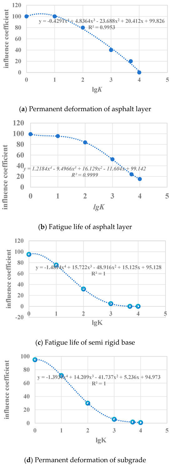 Analysis in Section 5 reveals the significant influence of the interlayer bonding performance on asphalt pavement performance. Given the absence of established standards for interlayer adhesion coefficients, critical values were determined by evaluating the impact of the bonding coefficient between the semi-rigid base and asphalt layer on structural performance. A representative 7-layer highway pavement structure (properties in Table 9) was analyzed using adhesion coefficients between the CSM and asphalt layer ranging from complete sliding to complete bonding (1, 10, 100, 1000, 5000, 10,000 MPa/cm). As shown in Table 14, this bonding condition minimally affects asphalt layer permanent deformation, moderately influences semi-rigid base fatigue life and subgrade permanent deformation, and most significantly impacts CSM fatigue life. Influence coefficients calculated via Equation (8) (Figure 14, Table 15) yielded the control values in Table 16 using a 10% influence threshold. Notably, asphalt layer permanent deformation—being substantially below the specification limit of 10 mm—was excluded from this control criterion. The results demonstrate that interlayer bonding coefficients exceeding 5000 MPa/cm effectively represent complete bonding between the CSM and asphalt layers.