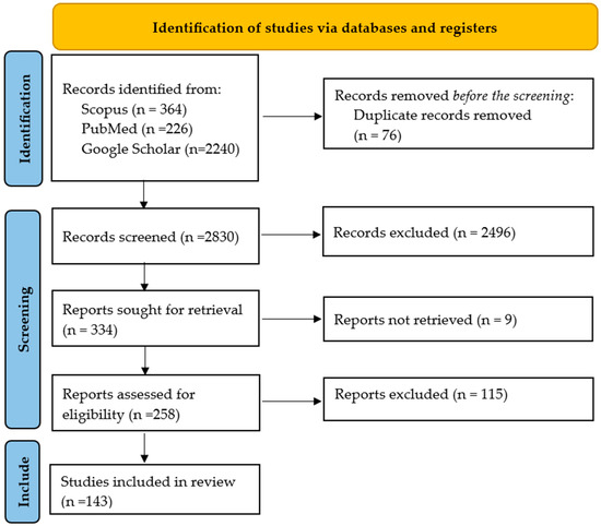 The data were recorded in a Microsoft Excel worksheet. Two authors independently reviewed the titles, abstracts, and full texts, extracting all relevant data in accordance with the PRISMA 2020 guidelines. Duplicates were identified using the automatic detection function in EndNote 21, followed by manual review to ensure accuracy. Any disagreements regarding the inclusion of studies were resolved through discussions within the research team. The process of data identification, screening, and inclusion is summarised in Figure 1. Ultimately, a total of 143 studies were included in the final review.