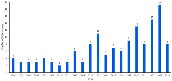 Figure 2 displays the annual distribution of publications about RCS dust research in the construction industry from 2004 to 2024. Initially, the research output was relatively low, with fewer than five papers published annually until around 2015. From 2015 onwards, there has been a gradual increase, reflecting growing academic and industry interest in silica exposure. The most notable rise begins around 2020, with publication numbers peaking in 2023, reaching 19 papers. This upward trend highlights an intensified focus on silica exposure, likely due to increased awareness of its health impacts and advancements in dust control measures in construction and related industries. Contributions come from diverse journals, highlighting interdisciplinary interest, including expansion in the scope to environmental research, public health, and occupational medicine. This distribution shows the breadth of research on silica exposure across occupational, environmental, and health disciplines.