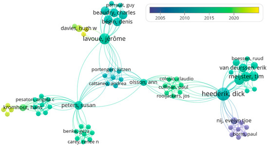 The co-author network analysis reveals a robust and evolving collaborative structure in silica exposure research, marked by distinct clusters and time-based patterns (Figure 3). Early collaborations, represented in blue, are anchored by foundational researchers like Heederik [34,35,36,37,38,39,40], Lavoué [6,9,41,42,43], Olsson [34,42,44], and Peters [42,44,45], whose longstanding contributions have shaped the field. These researchers lead dense clusters, indicating cohesive research teams focused on occupational silica exposure and health. Over time, additional authors have joined these networks, expanded the research scope, and reinforced established findings.