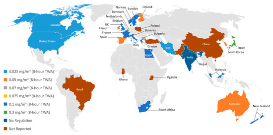 As illustrated in Figure 4, significant gaps also exist in underrepresented regions, such as parts of Africa (e.g., Ghana [63], Uganda [67], South Africa [68]), Southeast Asia (e.g., Malaysia [69]), and Latin America (e.g., Brazil [70]), where either no regulation exists or enforcement is limited. In these contexts, high reliance on informal construction sectors, insufficient dust suppression measures, and limited worker training contribute to sustained elevated silica exposure risks, underscoring the need for targeted, region-specific interventions.