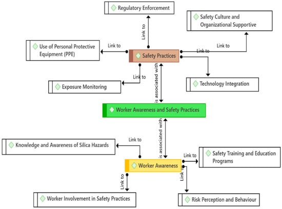 The analysis of the reviewed articles reveals the multifaceted nature of silica exposure management in construction. Worker awareness and safety practices are shaped by a complex interplay of factors, including knowledge levels, training efficacy, risk perception, proper PPE utilisation, procedural compliance, worker engagement, and organisational safety culture. The research underscores the necessity for holistic approaches that simultaneously address individual behaviours and systemic organisational factors. Effective strategies must integrate targeted education, innovative training methods, robust safety protocols, and a supportive organisational framework. Promoting a culture of shared responsibility and continuous improvement, the industry can significantly enhance safety practices and substantially mitigate silica exposure risks, ultimately safeguarding worker health in this high-risk sector. Figure 6 provides a comprehensive visualisation of worker awareness and safety practices currently implemented in the construction industry to mitigate silica exposure risks.