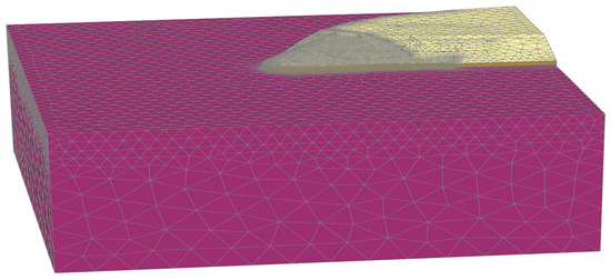 The FEM was built using PLAXIS 3D (Version 2, PLAXIS HEADQUARTERS, Delft, The Netherlands), covering a 200 m by 200 m area in plan and extending to a depth of 105 m. Figure 4 illustrates the finite element model domain, which encompasses the Main River and its surrounding subsoil layers, comprising over 770 × 103 finite elements and 1.2 million nodes. Figure 5a illustrates the detailed model. As described in Section 2.3, the CPRF system, which includes a 2 m thick triangular raft and 34 bored piles (1.5 m diameter, 40–45 m long), was modeled in detail (Figure 5b).