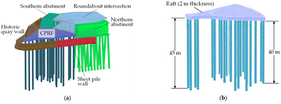 The construction process was modeled in stages, mirroring the actual order of site development. This included installing the quay wall, bridge abutments, micro piles, and CPRF system, followed by the application of superstructure loads. Such staged modeling is essential for accurately capturing time-dependent deformations and load redistribution, as demonstrated in previous numerical studies [18,21,22].