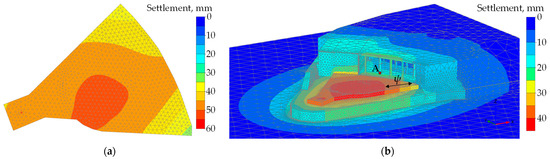 Calculated settlement: (a) the CPRF structure subjected to Graft,k + Gtot,k + Qtot,k; (b) the entire model for the CPRF structure subjected to Gtot,k + 1/3·Qtot,k.