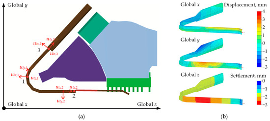 Calculation results: (a) relationship between local and global displacement for characteristic points “1”−”3”; (b) horizontal displacement and settlement of the quay wall subjected to Gtot,k + 1/3·Qtot,k.