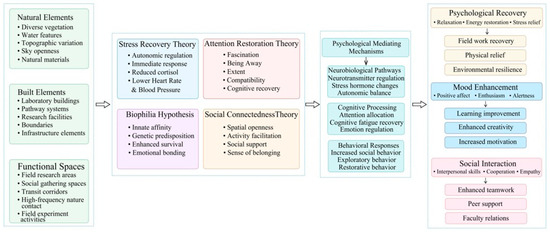 In recent years, the advancement of environmental psychology and cognitive behavioral science has brought increasing scholarly attention to the psychological impacts of campus spatial environments, positioning this topic as a critical intersection of urban planning, public health, and higher education research [35,36]. Natural elements and spatial configurations play essential roles in emotion regulation, attentional restoration, and social facilitation [37,38]. Building on classical theories, this study proposes three core psychological indicators: psychological restoration, emotional uplift, and social interaction, and constructs an evaluation framework to assess the effects of outdoor campus spaces. Figure 1 illustrates the theoretical foundations underlying the three psychological indicators.