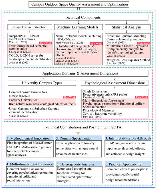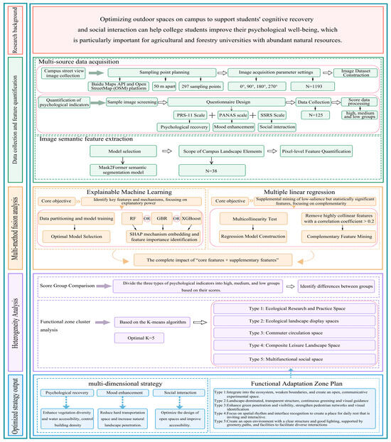 Conventional approaches to evaluating campus outdoor spaces rely heavily on small-scale, subjective surveys and manual observations, limiting scalability and overlooking complex nonlinear relationships between environmental features and psychological outcomes. This study applied machine learning (ML) to overcome these limitations, leveraging its ability to process large volumes of visual data, detect hidden patterns, and provide interpretable results through SHAP (Shapley additive explanations), thereby supporting both accurate prediction and actionable design insights. Focusing on a forestry university in China, we integrated Mask2Former-based image semantic segmentation, SHAP-based interpretable decision trees, and multivariate linear regression to examine how spatial features influence students’ emotional uplift, social interaction, and psychological restoration. Landscape features were extracted from campus images, and survey-based psychological scores were collected. Decision tree models (RF, XGBoost, GBR) combined with SHAP identified key features and threshold effects, while regression analysis detected statistically significant but lower-salience elements. Psychological scores were then categorized into high, medium, and low groups, and k-means clustering was used to define functional zones, enabling the analysis of heterogeneous effects across campus areas.