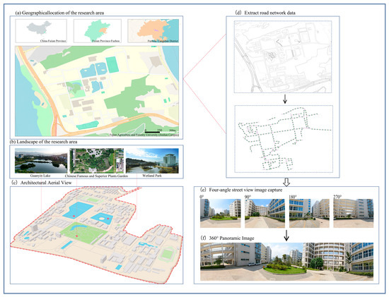 Fujian Agriculture and Forestry University (FAFU), a provincially key university founded in 1936, served as the research site for this study. Its geographic coordinates can be found at https://www.openstreetmap.org/#map=16/26.08711/119.23287 (accessed on 18 July 2025). The campus spans over 2560 mu (approximately 170 hectares) and is functionally divided into five main zones: teaching, residential life, sports, faculty housing, and supporting facilities. Geographically situated between the Youxi Bridge and the Min River, the campus benefits from favorable natural and transportation conditions. Notable landscape features include the Wetland Park, the China National Botanical Garden (Fujian branch), and Guanyin Lake.