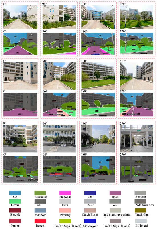 Semantic segmentation results of the campus panoramic images using the Mask2Former model.