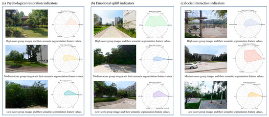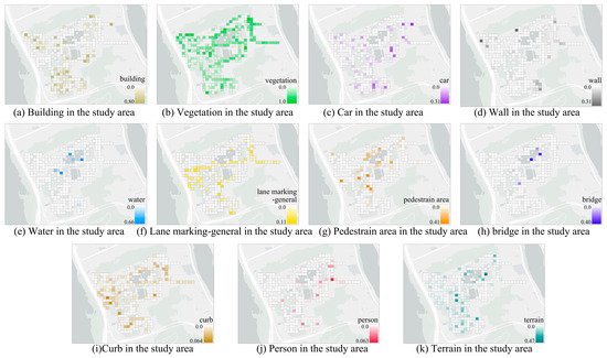 Figure 6 illustrates the spatial distribution of semantic features across the study area based on the full sample. The top six semantic features most influential to the three psychological indicators were selected, with duplicates removed to highlight the most representative factors.