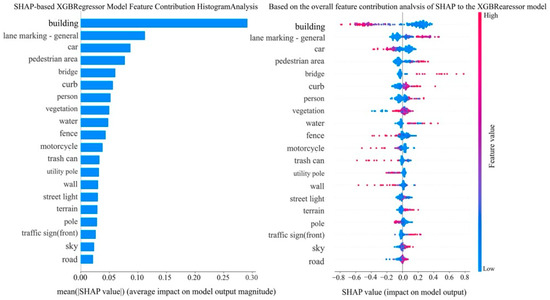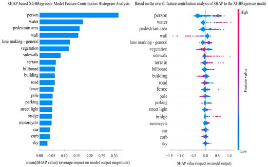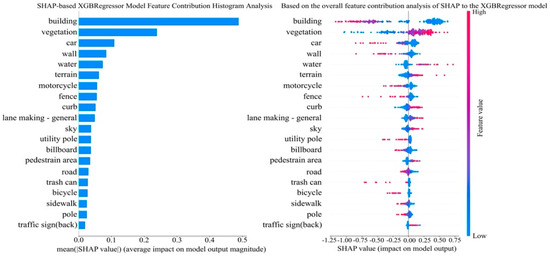 Figure 9 presents the SHAP analysis of image semantic features associated with the emotional uplift indicator based on the full-sample dataset. The results showed that hardscape elements, such as buildings, lane markings, vehicles, pedestrian areas, and bridges, exerted the most significant influence on the students’ emotional uplift. Overall, these features tended to have a negative impact, indicating that environments dominated by rigid infrastructural elements are less likely to enhance the students’ emotional states. These findings highlight the importance of balancing hardscape and softscape elements in campus space optimization to foster a more emotionally supportive and restorative environment.
