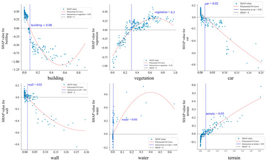 Figure 8 presents the influence patterns of the top six image semantic features contributing to psychological restoration, based on the full-sample SHAP analysis. As the values of these features varied, the direction and magnitude of their effects on the psychological restoration indicator also changed. Specifically, the building feature showed a positive impact when its value ranged from 0 to 0.08, but shifted to a negative influence beyond 0.08. The vegetation feature exerted an adverse effect at values below 0.3, and became a positive contributor when the value exceeded 0.3. Both car and wall features positively affected psychological restoration when their values were within 0 to 0.02, but their influence turned negative once they surpassed this threshold. The water feature consistently exerted a positive effect as long as its value was greater than zero. Finally, the terrain feature had a negative impact when its value was below 0.03, transitioning to a positive influence when it exceeded that level. These findings underscore the nonlinear and threshold-based nature of semantic landscape features in shaping students’ restorative experiences in campus outdoor spaces, emphasizing their role in campus space optimization.