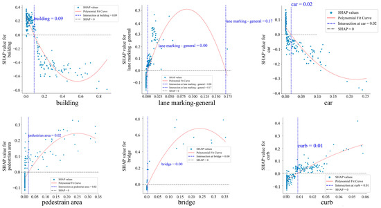 Figure 10 illustrates the influence patterns of the top semantic features contributing to emotional enhancement in the full-sample analysis, further elucidating the mechanisms by which these key features affect the emotional enhancement scores. Building features exerted a positive effect when their values ranged from 0 to 0.09, but became detrimental beyond 0.09. The lane marking—general feature had a negative impact below 0 and a positive impact above this threshold. Car features showed a negative effect between 0 and 0.02, turning positive when exceeding 0.02. Pedestrian area features negatively influenced emotional enhancement from 0 to 0.02, but shifted to a positive effect beyond 0.02. Bridge features were negative below 0 and positive above 0. Finally, curb features negatively affected emotional enhancement when below 0.01, but became positive when exceeding this value.