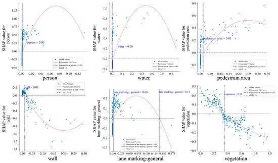 Figure 12 presents the influence patterns of the top-ranked semantic features contributing to social interaction in the full sample. A detailed analysis of the top six features ranked by SHAP values revealed distinct nonlinear influence trends. The person feature exhibited a consistently positive effect as long as its value was greater than zero. The water feature began to exert a positive influence when its value exceeded 0.0. The pedestrian area feature showed a positive effect once its value surpassed 0.01. The wall feature had a positive influence in the range of 0 to 0.01 but shifted to an adverse effect when the value exceeded 0.01. The lane marking—general feature was positively associated with social interaction when its value was greater than 0.0, but turned negative beyond 0.14. Finally, the vegetation feature positively affected social interaction within the 0–0.35 range but exhibited an adverse effect when it exceeded 0.35. Maintaining campus landscapes that have a positive impact and optimizing those that have a negative impact can foster better social interaction among students.