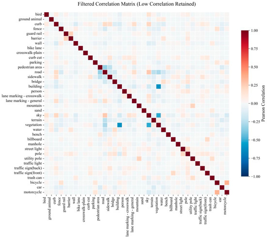 Figure 5 illustrates the semantic segmentation results of campus panoramic images using the Mask2Former model. Using a model pretrained on the Mapillary Vistas dataset, which supports recognition of a wide range of objects, we selected 38 key semantic categories closely related to psychological perception for further analysis. These selected features reflect critical visual components hypothesized to influence students’ emotional, social, and cognitive responses to the campus environment. Table 2 presents 38 semantic feature classes.