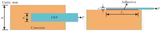 Fiber-reinforced polymer (FRP) composites are characterized by high strength, low weight, fatigue resistance, and corrosion resistance. In recent years, they have been widely used in engineering applications. The use of externally bonded FRP sheets to enhance the mechanical performance of reinforced concrete (RC) structures has become a common strengthening technique [,]. This involves bonding FRP plates (including sheets) to the surface of concrete at locations requiring reinforcement, primarily to resist shear and tensile forces. The bond strength at the interface between FRP and concrete plays a critical role in determining the mechanical performance of strengthened structural members [,]. While many previous studies have focused on the overall performance of reinforced components [,,], it is the bond behavior at the FRP–concrete interface that often determines the success and effectiveness of the reinforcement system in practical applications [].