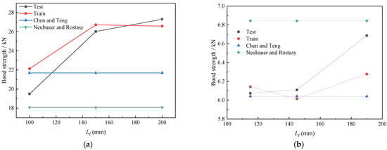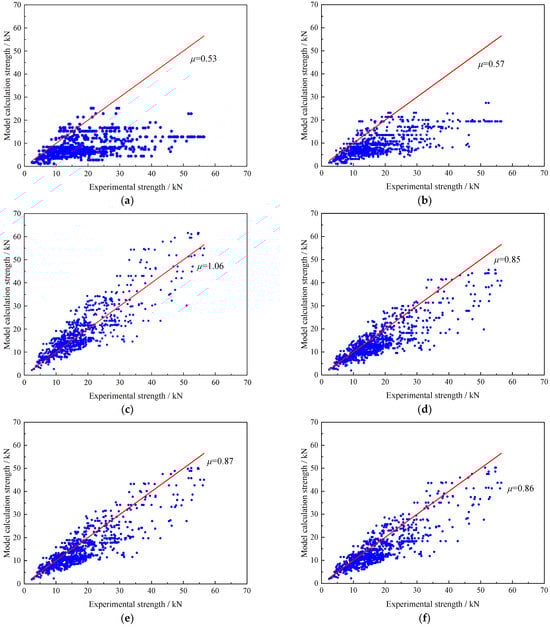Using the models listed in Table 2, predictions of bond strength were performed based on the collected dataset. The predicted values from each model were then compared to the experimental values, and a scatter plot illustrating the correlation between experimental and predicted bond strengths is presented in Figure 2. The mean ratio of predicted to experimental values (μ) was used to evaluate model performance, with values closer to 1 indicating higher accuracy. The results show that models ignoring the bond length effect generally yielded lower prediction accuracy, whereas the model proposed by Neubauer and Rostasy [] achieved a mean ratio of 1.06, indicating relatively high predictive precision.