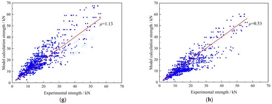 Calculation strength of existing models. (a) Tanaka []; (b) Hiroyuki and Wu []; (c) Neubauer and Rostasy []; (d) Seracino et al. []; (e) Matthys. []; (f) Chen and Teng []; (g) Monti et al. []; (h) Kanakubo et al. [].