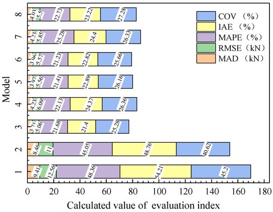 The calculated values of various evaluation metrics comparing the collected experimental data with the predicted results from existing models are presented in Figure 3. The accuracy of each model’s prediction was assessed based on several statistical indicators: mean absolute deviation (MAD), root mean square error (RMSE), mean absolute percentage error (MAPE), and integral of absolute error (IAE). In addition, the dispersion of model predictions was evaluated using the coefficient of variation (CoV). Specifically, MAD represented the average of the absolute deviations between individual observations and their arithmetic mean; RMSE was the square root of the average squared difference between the predicted and actual values; MAPE was a percentage-based transformation of MAD, providing an intuitive sense of prediction accuracy; IAE evaluated the prediction by quantifying the cumulative error area; and CoV, defined as the ratio of the standard deviation to the mean of the predicted values, allowed for comparison across models by eliminating the influence of units and scale.