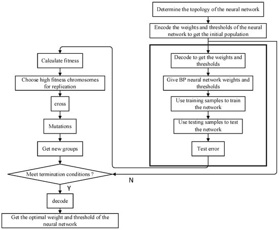 The genetic algorithm enhanced both the convergence rate and prediction accuracy of the neural network by optimizing its initial weights and thresholds. Key components of the genetic algorithm included population initialization, fitness evaluation, selection, crossover, and mutation. Each weight or threshold was encoded using a 10-bit binary string, resulting in a chromosome length of 1050 bits. The objective function was defined as the norm of the error between predicted and actual outputs. A rank-based fitness assignment method was adopted, with the fitness calculated as FitnV = ranking(obj), where obj is the objective function value. Selection was carried out using a stochastic tournament method, and crossover was implemented using a single-point approach. The specific parameters used in the genetic algorithm are summarized in Table 3.
