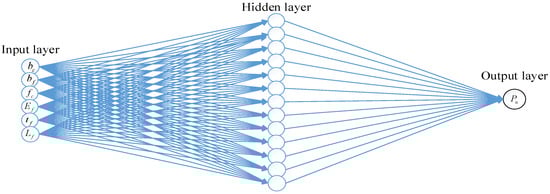 The connections between layers were governed by transfer functions, connection weights, and thresholds. The hyperbolic tangent sigmoid function (tansig), as defined in Equation (6), was adopted as the transfer function between the input and hidden layers. The connections between layers were governed by transfer functions, connection weights, and thresholds.