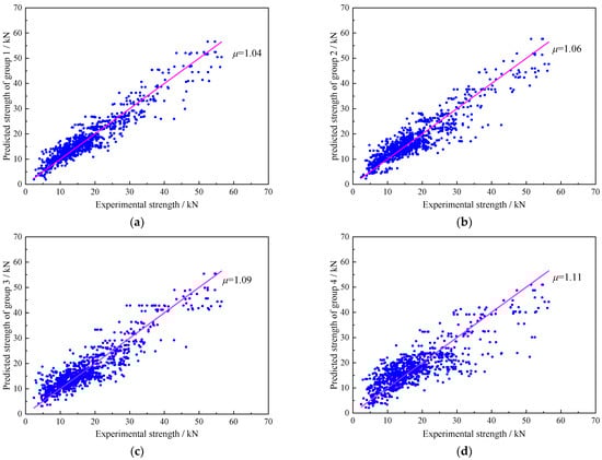 where Testi denotes the i-th experimental bond strength; Traini denotes the corresponding predicted value; and μ represents the mean ratio of predicted to experimental values.