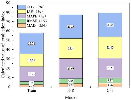The evaluation metrics of the selected GA-BP neural network model with those of the Chen and Teng model and the Neubauer and Rostasy model are shown in Figure 7. “Train” refers to the predictions generated from the first GA-BP neural network model configuration (six-node input), while “C-T” and “N-R” correspond to predictions based on the Chen and Teng and Neubauer and Rostasy models, respectively. The results clearly show that the GA-PA predicted bond strengths exhibit significantly higher accuracy compared to the existing empirical models.