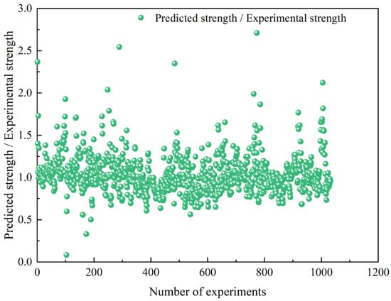 As shown in Figure 8 and Figure 9, the predicted bond strength values obtained from the GA-BP neural network model versus the experimental values for all 1032 specimens, illustrating the model’s high consistency with experimental data. As shown in Figure 10, it further explores the relationships between the ratio of predicted to experimental values and each of the six input parameters. In these plots, the closer the vertical axis values are to 1, the smaller the prediction deviation and the higher the computational accuracy.