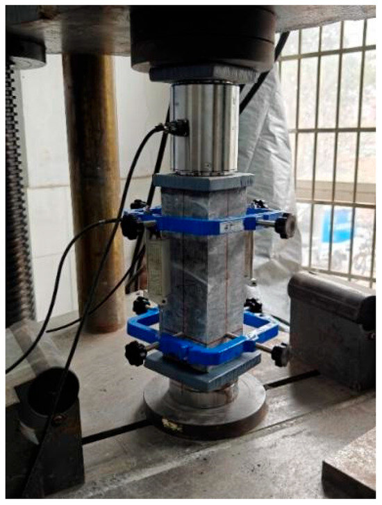 Uniaxial compression tests were performed on six UHPC specimens (100 mm × 100 mm × 300 mm, Figure 1 and Figure 2). The UHPC exhibited excellent compressive deformation behavior, with a peak strain reaching 3500 με. Even after significant cracking, the specimens retained 85% of their peak strength. The elastic modulus during the ascending phase was calculated as 47.091 GPa. The average compressive strength of the UHPC specimens was 122.3 MPa (Table 1).