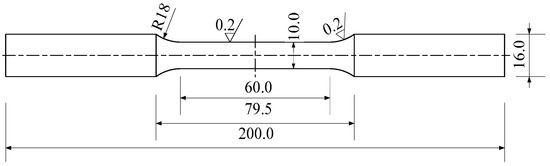 All steel girders in the test specimens used Q355B grade steel. Selection of standard coupon dimensions, machining tolerances, and uniaxial tensile testing strictly adhered to “Metallic materials-Tensile testing-Part 1: Method of test at room temperature” (GB/T 228.1-2021) [33]. Three standard coupons were tested. Dimensions and machining requirements are shown in Figure 3. Basic mechanical properties are listed in Table 2.