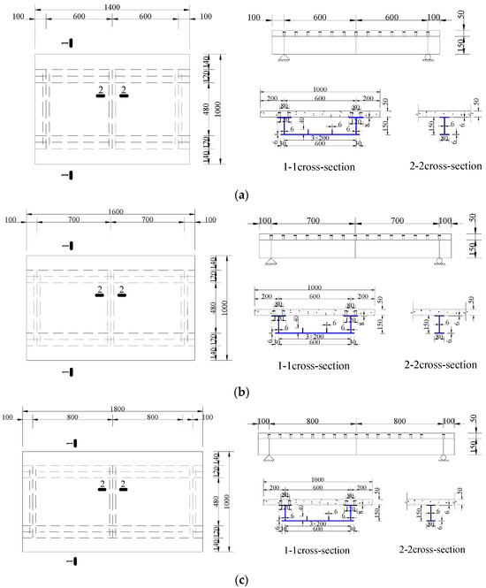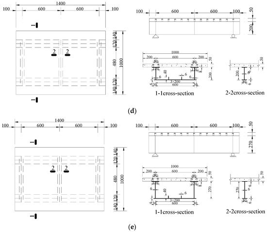 Dimensions of the specimens (Unit: mm), (a). UHPCCG-1 (L/b = 1.2, b/H = 5); (b). UHPCCG-2 (L/b = 1.4, b/H = 5); (c). UHPCCG-3 (L/b = 1.6, b/H = 5); (d). UHPCCG-4 (L/b = 1.2, b/H = 4); (e). UHPCCG-5 (L/b = 1.2, b/H = 3.2).