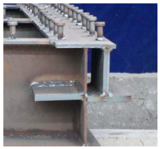 Five straight-web box-section steel-UHPC composite girder specimens (Figure 4) were designed and fabricated. All test girders were simply supported with the following configurations:UHPCCG-1 featured a span-to-width ratio (L/b) of 1.2:1 and width-to-height ratio (b/H) of 5:1; UHPCCG-2 had a span-to-width ratio (L/b) of 1.4:1 and width-to-height ratio (b/H) of 5:1; UHPCCG-3 showed a span-to-width ratio (L/b) of 1.6:1 and width-to-height ratio (b/H) of 5:1; UHPCCG-4 demonstrated a span-to-width ratio (L/b) of 1.2:1 and width-to-height ratio (b/H) of 4:1; UHPCCG-5 exhibited a span-to-width ratio (L/b) of 1.2:1 and width-to-height ratio (b/H) of 3.2:1. Each specimen consisted of a steel box girder and a UHPC deck slab. Key structural features included: double longitudinal stiffeners on the steel bottom flange; composite action provided by headed stud shear connectors welded to the steel top flange. All studs had a diameter of 14 mm and a height after welding of 40 mm, arranged differentially: (1) Single-row layout (spacing 100 mm) in end plate and diaphragm regions; (2) Double-row layout (row spacing 80 mm, longitudinal spacing 100 mm) on the top flange over the webs. Single-row studs were used on crossbeam and diaphragm top flanges, while double-row studs were used on longitudinal girder top flanges. An axial loading fixture was welded to the outside of each web end. The fixture end was flush with the web end, with a 35 mm gap between the fixture side plate and the web to accommodate a 30 mm diameter threaded steel bar for axial loading, as shown in Figure 5. This experimental study examines how axial force asymmetry, span-to-width ratio (L/b), and width-to-height ratio (b/H) affect strain distribution patterns in the concrete flange.