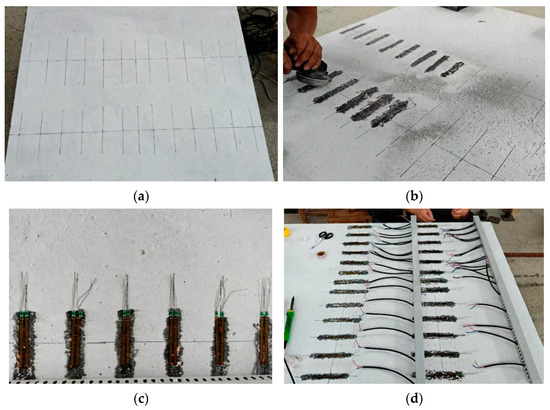 The steel girder components were fabricated in a steel workshop. All five specimens were cast on-site. After casting, they were covered with film and watered every two hours. Upon reaching the design concrete strength, formwork was removed, latex paint was applied to the concrete surface, and specimens were moved to a secure location for loading. Specimen fabrication is shown in Figure 6. To study the shear lag effect of the UHPC slab, the transverse distribution of the normal strain was measured. Strain gauges were mounted on the UHPC slab’s upper surface at 120 mm intervals, each with a 200 mm gauge length. Strain gauges were bonded following the steps shown in Figure 7.
