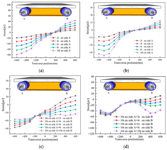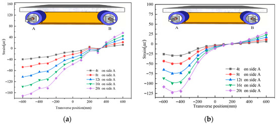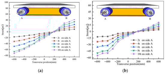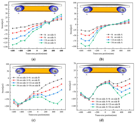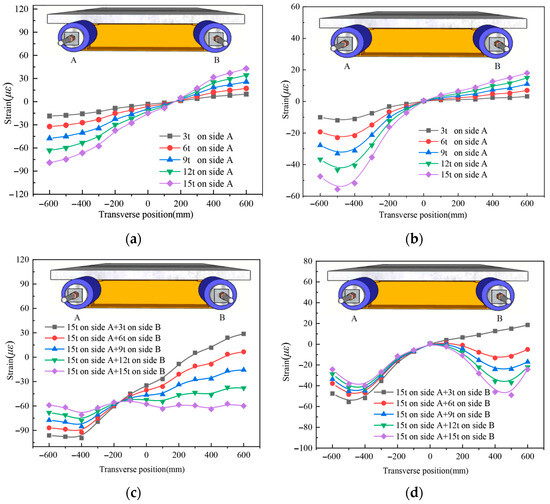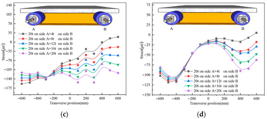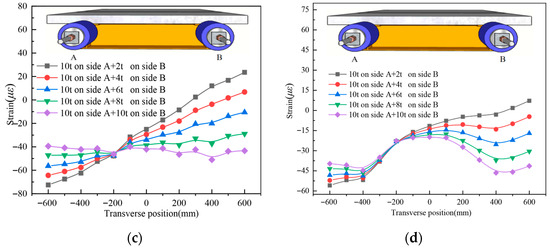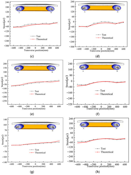 Strain distribution comparison in the UHPC slab of specimen UHPCCG-1, (a). UHPCCG-1-L/2 section (6 t on side A and 3 t on side B); (b). UHPCCG-1-L/4 section (6 t on side A and 3 t on side B); (c). UHPCCG-1-L/2 section (9 t on side A and 6 t on side B); (d). UHPCCG-1-L/4 section (9 t on side A and 6 t on side B); (e). UHPCCG-2-L/2 section (10 t on side A and 6 t on side B); (f). UHPCCG-2-L/4 section (10 t on side A and 6 t on side B); (g). UHPCCG-3-L/2 section (10 t on side A and 6 t on side B); (h). UHPCCG-3-L/4 section (10 t on side A and 6 t on side B).