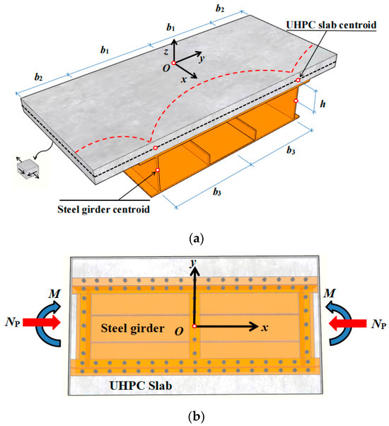 Schematic for analysis of composite girder under eccentric axial loading, (a). Analysis model of shear lag effect in Steel-UHPC composite Girders; (b). Equivalent Load Diagram under Eccentric Axial Load.
