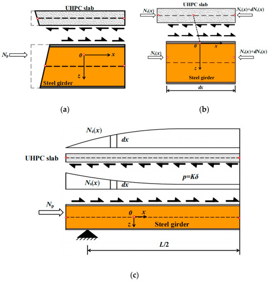 Analysis of the mechanical behavior in cable anchorage zones of composite girders indicates that concentrated loads anchored to the steel girder induce significant interfacial slip between steel and UHPC. As illustrated in Figure 15a, actual deformation at the girder end shows localized separation. The force diagram for a composite girder micro-segment is shown in Figure 15b, and the interfacial shear transfer mechanism is depicted in Figure 15c. Reflecting the actual structural behavior of composite box girders, the analysis assumes: (1) identical vertical displacements between the UHPC slab and steel girder, thereby ignoring uplift of the UHPC slab; and (2) longitudinal displacement incompatibility, permitting interfacial slip.