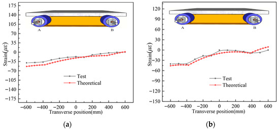 To validate the theoretical solution for shear lag in steel-UHPC composite girders under asymmetric axial loading, the longitudinal strain distribution on the top surface of the UHPC slab for specimens UHPCCG-1-UHPCCG-3 under selected load cases was compared with theoretical predictions. Results are shown in Figure 16. The analytical solution exhibits high consistency with the experimental data, with an average deviation within 5%. The good agreement effectively verifies the correctness and applicability of the theoretical solution.