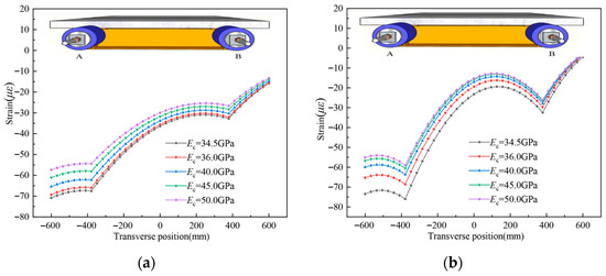 The elastic modulus Ec was designed as 34.5 GPa, 36 GPa, 40 GPa, 45 GPa, and 50 GPa to conduct a parametric sensitivity analysis on the shear lag effect. The resulting strain distributions are shown in Figure 17. As can be observed from the figure, a distinct shear lag effect is evident. As Ec increases, the magnitude of concrete surface strains decreases, and the shear lag effect is significantly reduced. This suggests that using higher-strength concrete is an effective way to mitigate shear lag.