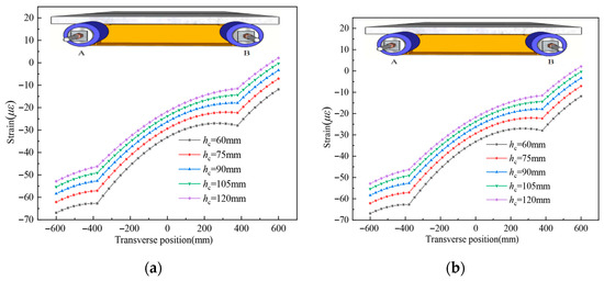 Holding the girder width b constant, the width-to-height ratios of the composite girder were set as 5.0, 3.3, 2.5, 2.0, and 1.7 to investigate the influence of the width-to-height ratio on the shear lag effect. Strain distributions are shown in Figure 23. As shown in the figure, decreasing the width-to-depth ratio increases the magnitude of strains on the UHPC slab surface at both the L/2 section and L/4 section under symmetric axial loading. The shear lag effect intensifies as the width-to-depth ratio decreases.