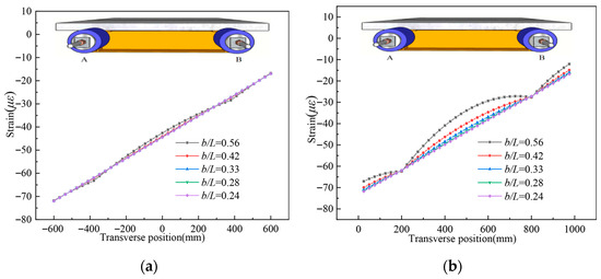 To investigate parameter sensitivity, width-to-span ratios (b/L) of 0.56, 0.42, 0.33, 0.28, and 0.24 were selected. Figure 19 presents the corresponding strain distributions. At the L/2 section (Figure 19a), strain magnitude exhibits minimal variation with decreasing b/L. Conversely, at the L/4 section (Figure 19b), decreasing b/L yields more uniform strain distributions, indicating attenuated shear lag effects. Quantitatively, the shear lag coefficient decreases by 27%—from 1.30 at b/L = 0.56 to 1.02 at b/L = 0.24. This demonstrates the substantial impact of the width-to-span ratio on shear lag behavior. The underlying mechanism is that wider flanges (higher b/L) cause greater attenuation of shear flow during transverse transmission. This reduces shear stress at the flange edges, consequently lowering longitudinal normal stress.