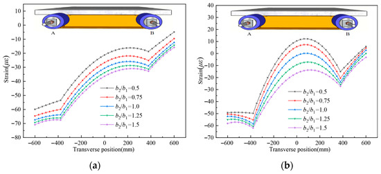 Longitudinal strain distribution on the top surface of the concrete slab for different b2/b1; (a). L/2 section; (b). L/4 section.