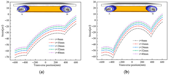 Five different steel flange plate thicknesses are set as follows: 8 mm, 16 mm, 24 mm, 32 mm, and 40 mm. Calculated strain distributions are shown in Figure 21. As shown in the figure, increasing the steel top flange thickness has a minimal effect on the UHPC slab strain distribution pattern at both the L/2 section and L/4 section. This indicates that the thickness of the upper flange plates of the steel beam has a negligible effect on the shear lag effect.