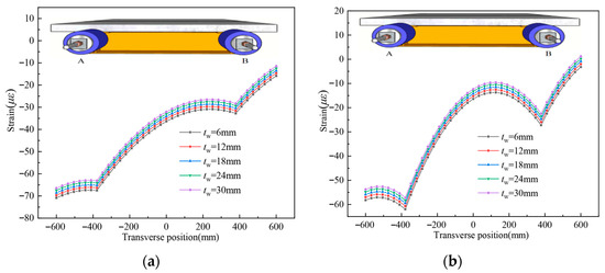 Five different steel web plate thicknesses are set as follows: 6 mm, 12 mm, 18 mm, 24 mm, and 30 mm. The influence of the thickness of the steel web plate on shear lag behavior is displayed in Figure 22. Steel web thickness exerts a measurable, albeit relatively small, influence on shear lag compared to the top flange. Doubling the web thickness reduces the maximum UHPC slab strain near the web by only about 2%, indicating limited effectiveness. On the contrary, increasing the thickness of the web plate significantly increases the self-weight and cost of the composite girder.